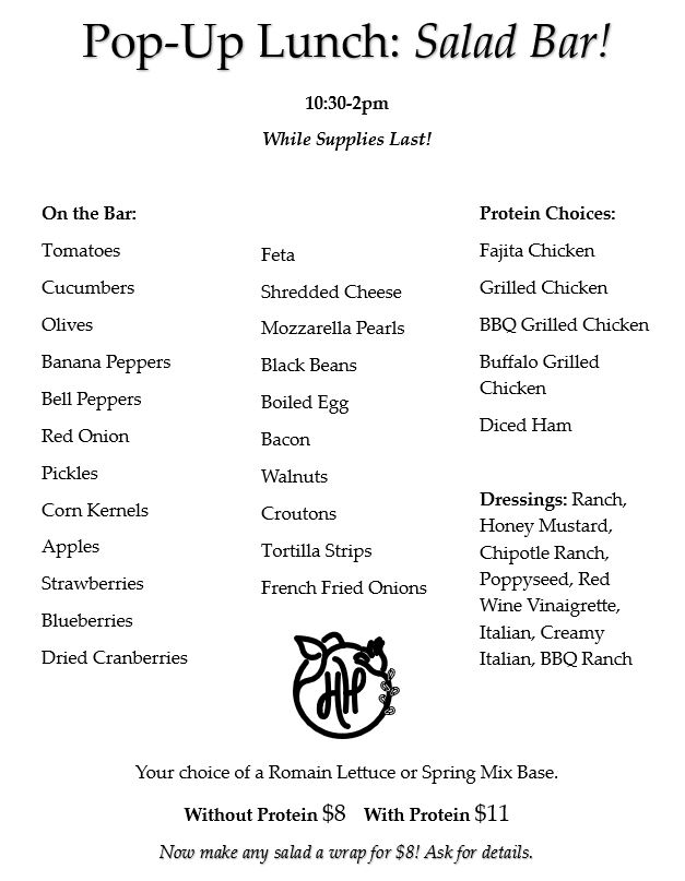 *Pop-Up Lunch Tomorrow!* Posted byhummingbirdhousecateringOctober 27, 2024Posted inUncategorized Tomorrow, Monday 10/28! Share this: Share on X (Opens in new window) X Share on Facebook (Opens in new window) Facebook Like Loading... Related Published by hummingbirdhousecatering Owner and operator of Hummingbird House Catering. View more posts