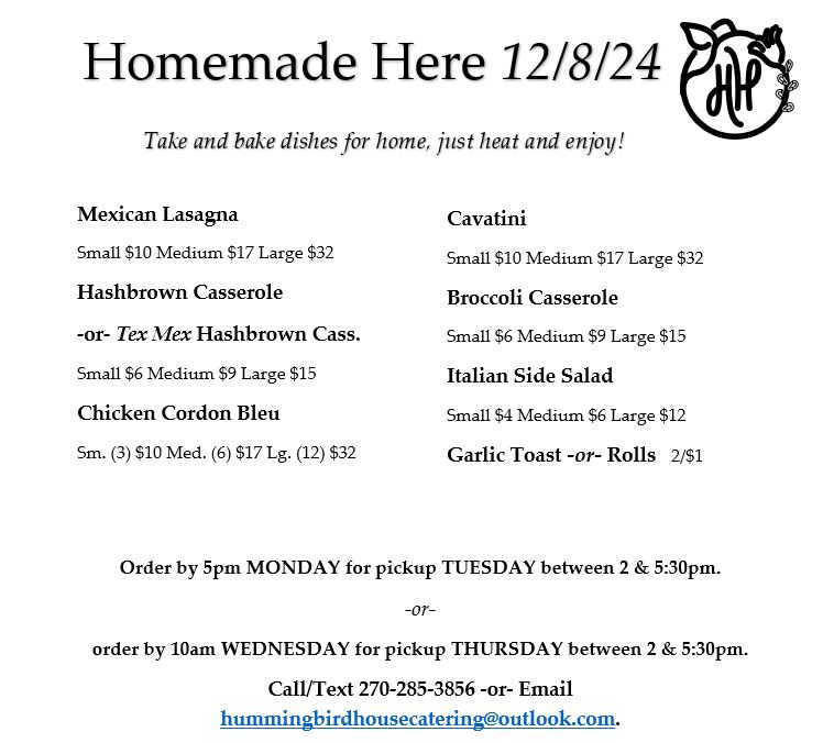Homemade Here Week of 12/8/2024 Posted byhummingbirdhousecateringDecember 8, 2024Posted inUncategorized Remember to order a casserole to take to that Christmas party this weekend ☑️ Share this: Share on X (Opens in new window) X Share on Facebook (Opens in new window) Facebook Like Loading... Related Published by hummingbirdhousecatering Owner and operator of Hummingbird House Catering. View more posts