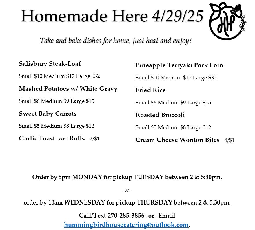 Homemade Here Week of 4/29/2025 Posted byhummingbirdhousecateringApril 27, 2025Posted inUncategorized Share this: Share on X (Opens in new window) X Share on Facebook (Opens in new window) Facebook Like Loading... Related Published by hummingbirdhousecatering Owner and operator of Hummingbird House Catering. View more posts