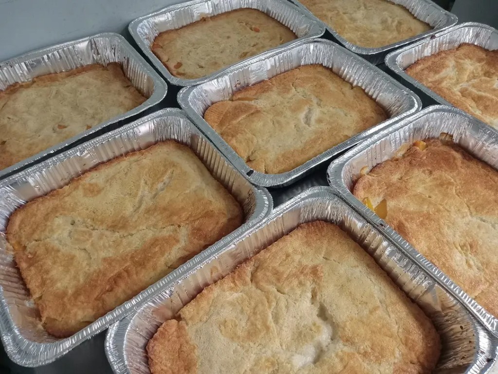 We have full pans of Peach Cobbler ready to claim for $20/each. And several pans of White Chocolate Bread Pudding ($25) will be ready at 3pm. These are available for anyone to claim.