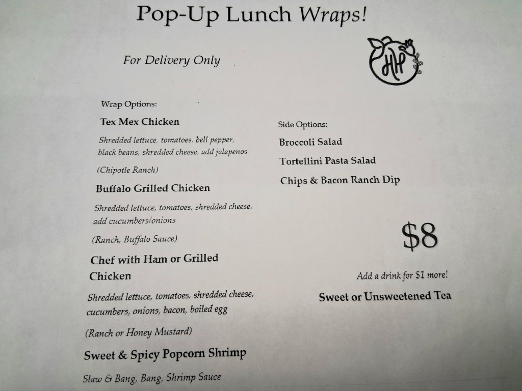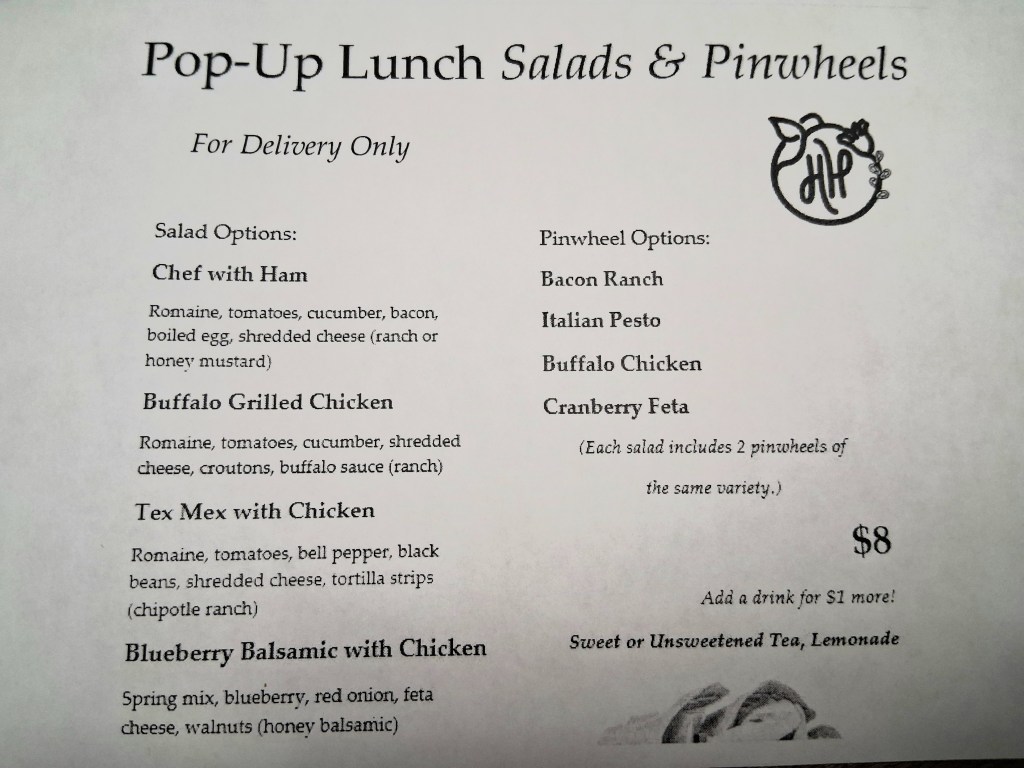 Be sure to contact us to get on the list BEFORE collecting orders. We’ll need Soup orders by Monday afternoon; Salad/Wrap orders by Tuesday morning.
